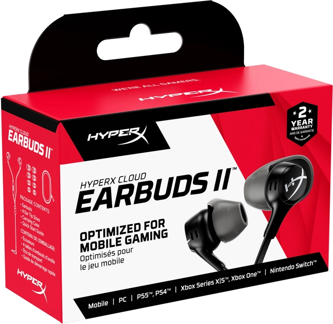 У комплект Cloud Earbuds входять запатентовані силіконові насадки трьох розмірів, які забезпечують фірмовий комфорт HyperX – ідеальний вибір для тривалих ігор. Завдяки покращеним басам, а також кристально чистим високим, середнім та низьким частотам у цих навушниках ви зможете насолодитися ефектом занурення у звук.