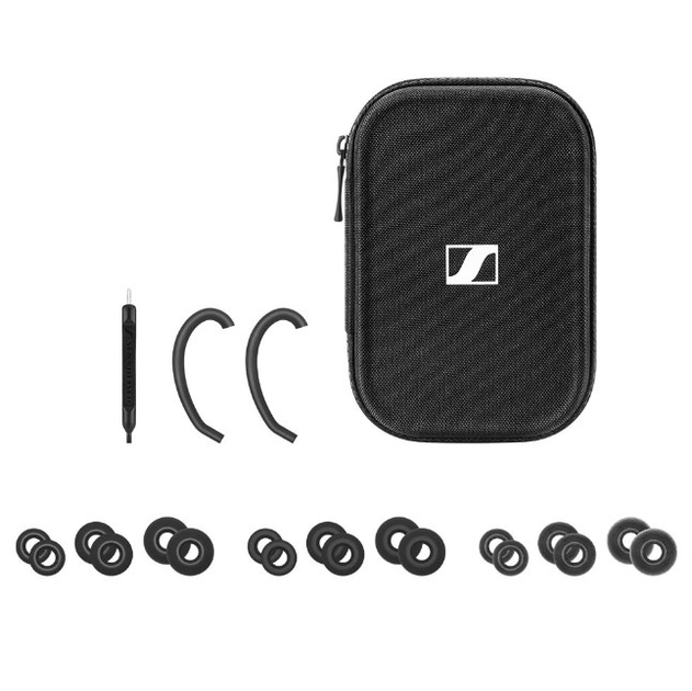 Коригуванням рівня басу в ес-моделі справа не закінчується: є ще випромінювачі сильними неодимовими магнітами, кабель (1,2 м, 2-пінові роз'єми Sennheiser, пульт з мікрофоном), оновлений дизайн напівжорсткого кейсу відмінної якості. У комплекті заушний гачок та набір різнорозмірних амбюшур (піна, силікон).