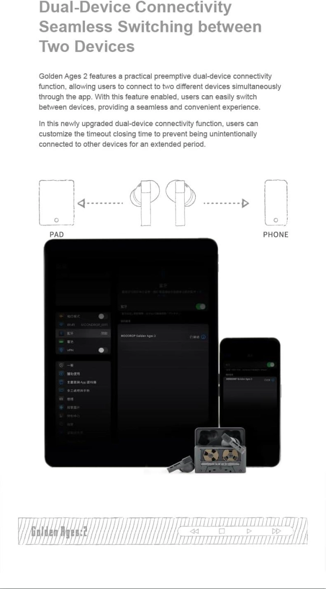 Завдяки спеціально виготовленим чіпам та вбудованим гіроскопам у навушниках, Golden Ages 2 можуть активувати спеціально налаштовану функцію «динамічного просторового звуку» через додаток MOONDROP. Користувачі можуть легко перемикатися між трьома режимами: «статичний», «малий кут» та «всеспрямований». Примітно, що інноваційний дизайн «малого кута» покращує бінауральне слухове позиціонування, регулюючи рух голови, забезпечуючи правильну орієнтацію аудіозображень під час руху. Ця функція особливо практична для відтворення звуку в різних умовах.