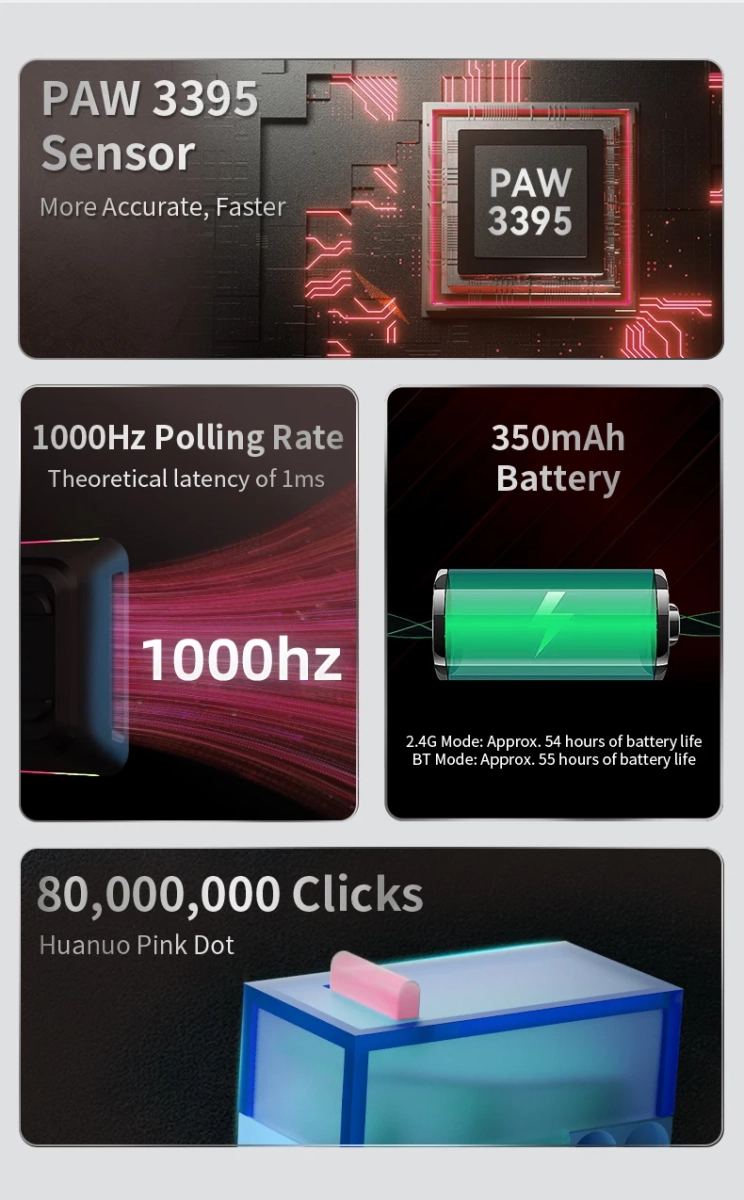 AJAZZ M259 оснащено датчиком високого класу PAW3395. Він забезпечує чудову точність і плавний рух миші з максимальною чутливістю 26000 точок на дюйм. Миша M259 має швидкість відстеження 650 IPS і прискорення 50G. Завдяки сенсору PAW3395 M259 пропонує ідеальний ігровий досвід.