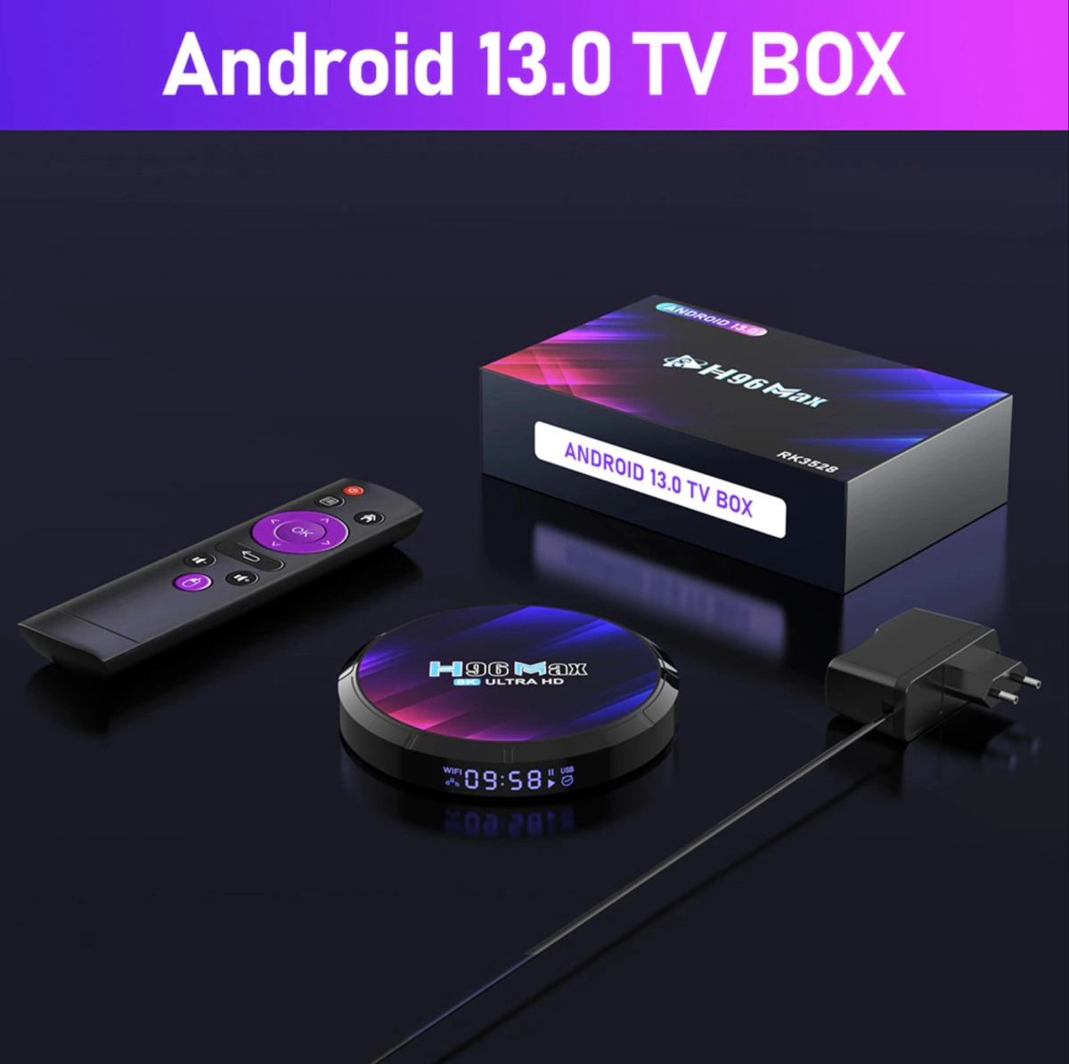 H96 max — ТБ-приставка на операційній системі Android 13.0 працює під керуванням чотириядерного процесора RK3528 і п'ятиядерного графічного супроцесора Mali-450, обладнана дводіапазонним модулем Wi-Fi та підтримує під'єднання до інтернету через кабелю на швидкості до 100 Мбіт/с.