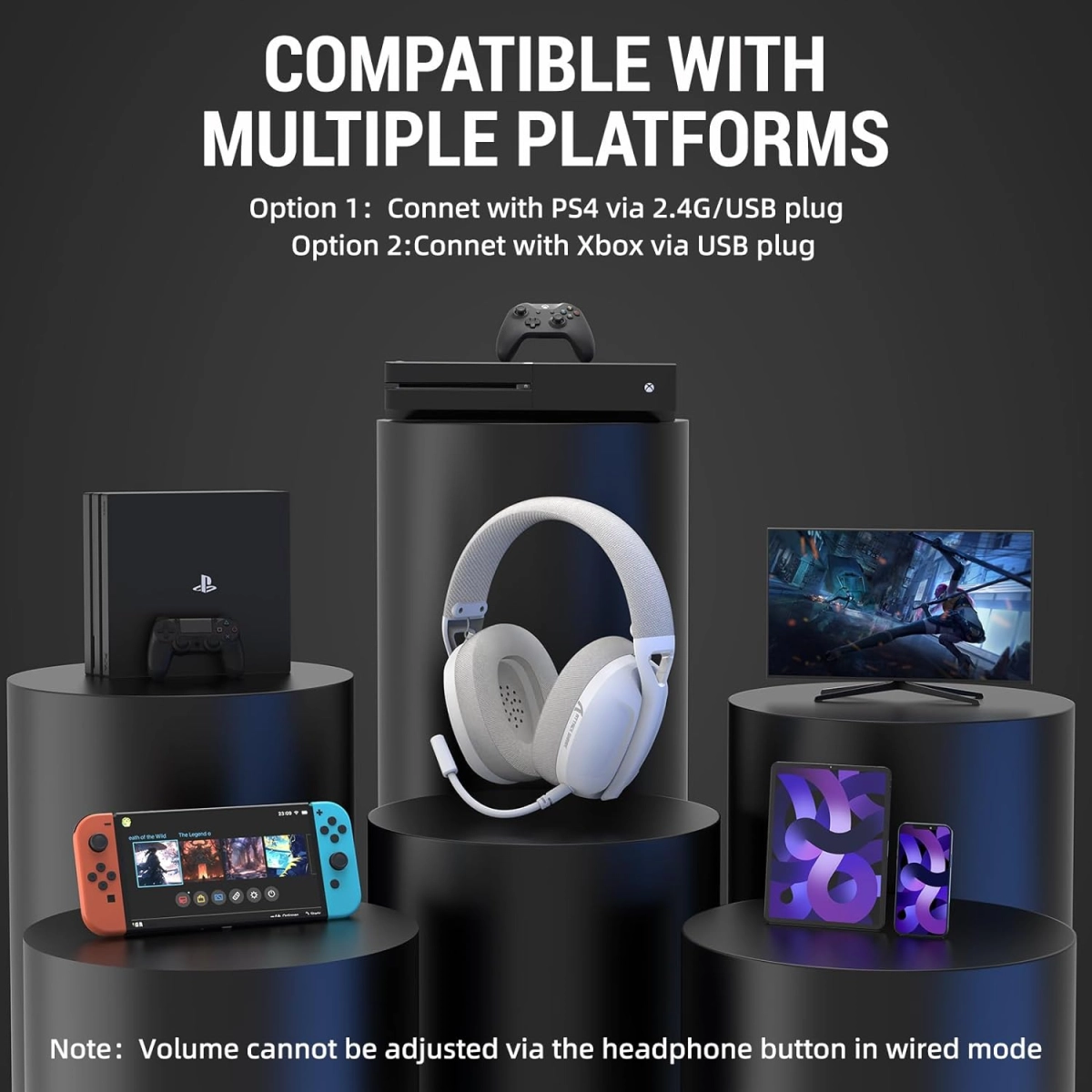 Відчуйте неперевершене занурення в ігри завдяки розширеному з’єднанню Bluetooth 5.2, бездротовому з’єднанню з низькою затримкою 2,4 ГГц і дротовому з’єднанню 3,5 мм. Накладні навушники з бездротовою ігровою гарнітурою L80 сумісні з Nintendo Switch, ПК, PS4, PS5, ноутбуком, планшетом, iPad і мобільними телефонами.