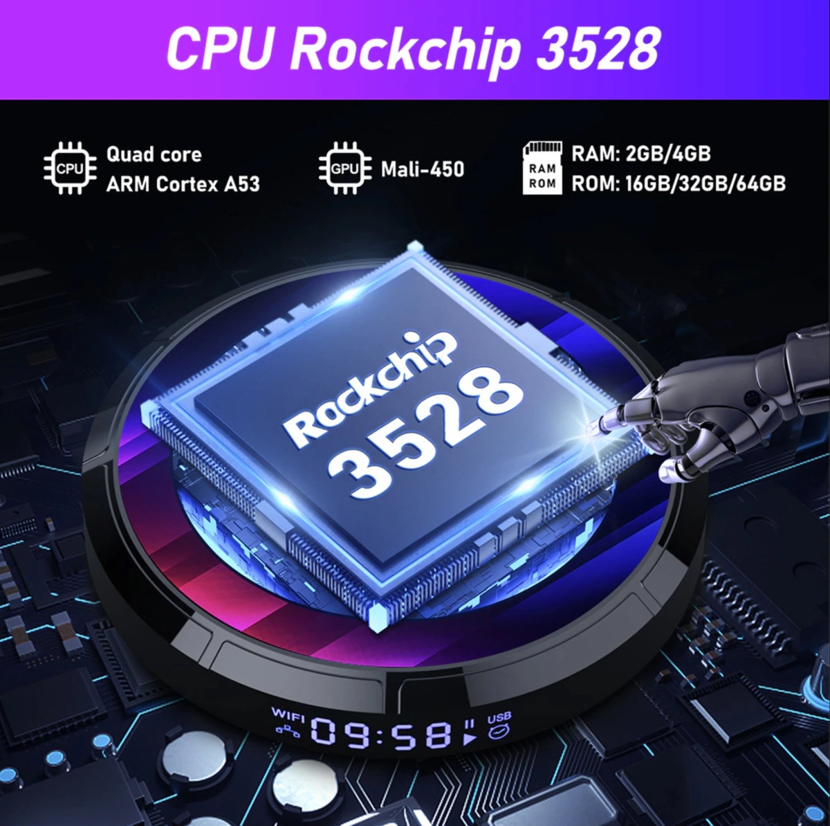 H96 max — ТБ-приставка на операційній системі Android 13.0 працює під керуванням чотириядерного процесора RK3528 і п'ятиядерного графічного супроцесора Mali-450, обладнана дводіапазонним модулем Wi-Fi та підтримує під'єднання до інтернету через кабелю на швидкості до 100 Мбіт/с.