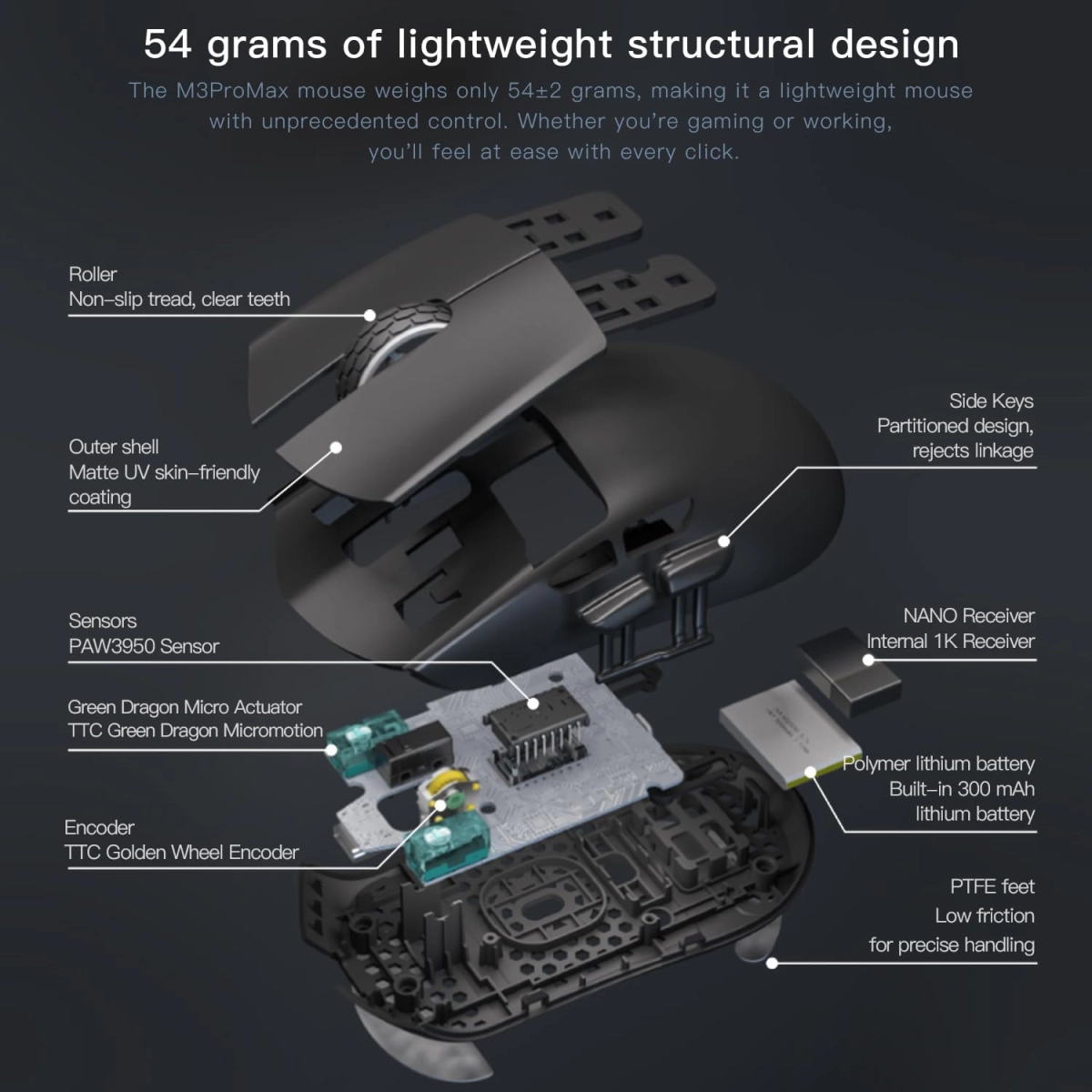 Миша оснащена датчиком PAW3950, який надає роздільну здатність до 30000 DPI, швидкість відстеження 750 IPS і частоту відгуку 1000 Гц. Такі характеристики забезпечують швидкість і точність, необхідні для ігрових застосувань.