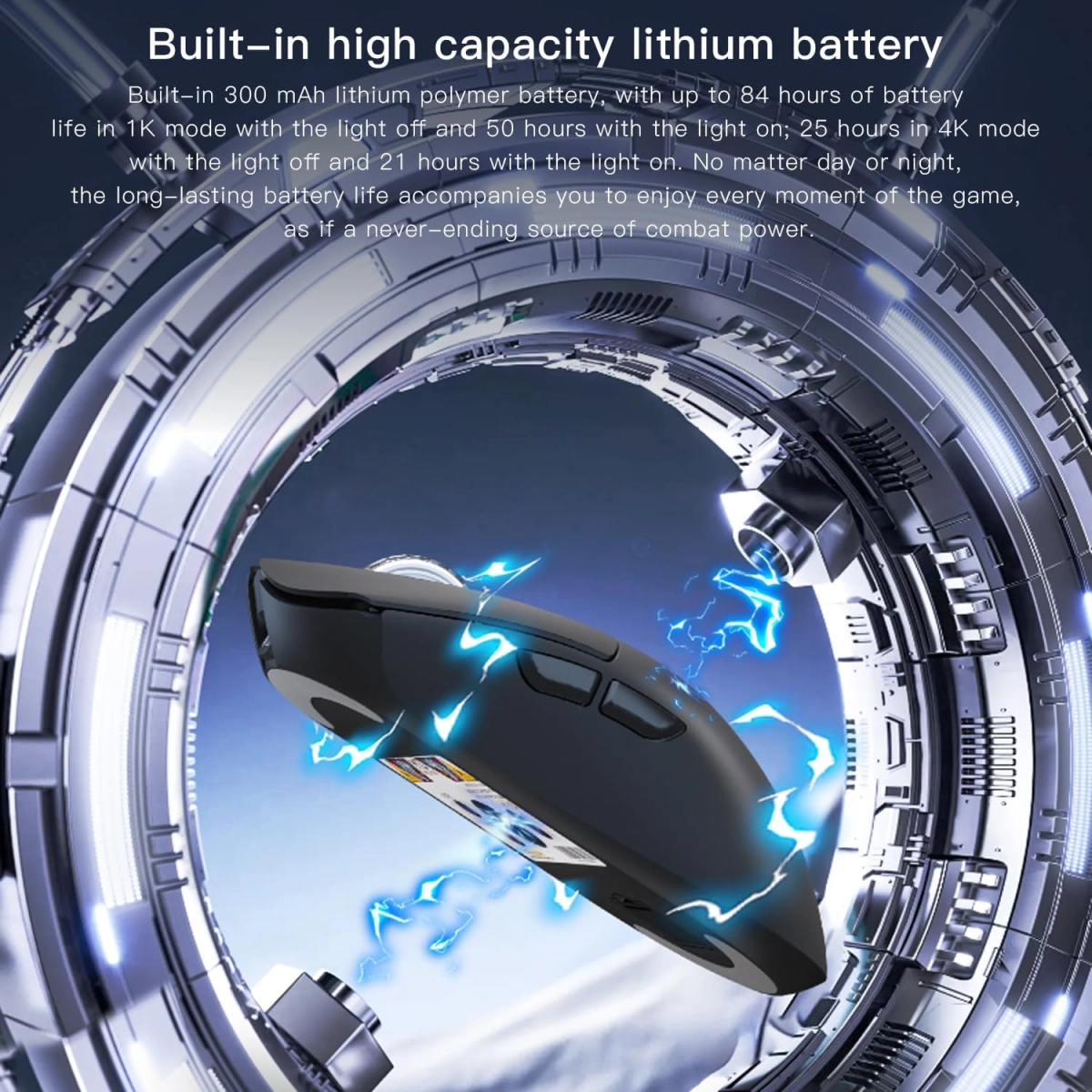 Завдяки високої щільності літієвій батареї ємністю 500 мАг миша забезпечує до 83 годин безперервного використання, що робить її ідеальним вибором для довгих ігрових сесій.