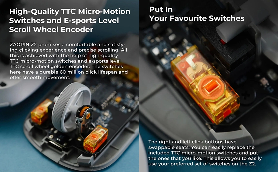 ZAOPIN Z2 обіцяє зручне та приємне натискання та точне прокручування. Все це досягається за допомогою високоякісних перемикачів TTC micro-motion і золотистого енкодера кіберспортивного рівня TTC scroll wheel. Перемикачі тут витримують 60 мільйонів натискань і забезпечують плавний рух.