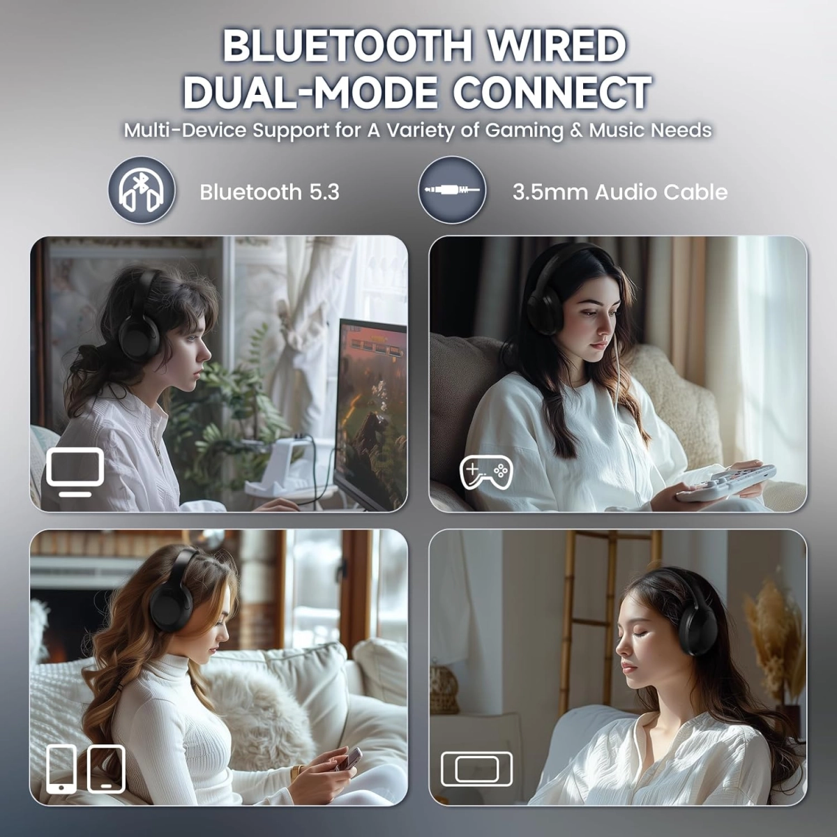 Оснащений найновішим чіпом Bluetooth 5.3, він має швидший і стабільніший діапазон передачі даних до 33 футів. Накладні навушники сумісні зі смартфонами, iPhone, Android, MP3, MP4, ноутбуками, iPad, iPod і багатьма іншими пристроями з підтримкою Bluetooth. Крім того, він підключається до будь-якого пристрою, який підтримує аудіокабель 3,5 мм.