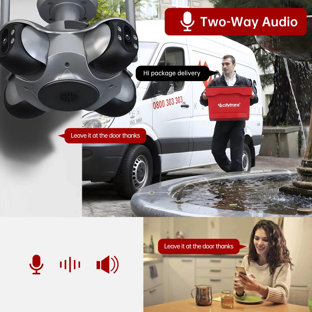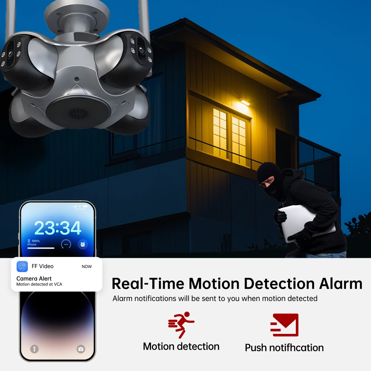 Основні характеристики: ●Підтримка Wi-Fi 2,4 ГГц. ●4-об'єктивна камера одночасно контролює 4 зони та відображає 4 зображення у мобільному додатку. ●Дистанційне керування PTZ ●Двосторонній аудіозв'язок ●Виявлення людини/руху ●Автоматичне відстеження ●Локальна пам'ять (карта TF) та хмарне сховище (безкоштовно) ●Перегляд у режимі реального часу кількома користувачами ●Інфрачервоне/кольорове нічне бачення ●Пило- та водонепроникність IP66 ●Роздільна здатність одного об'єктива — 5 МП, роздільна здатність 4 об'єктивів — 5 МП+5 МП+5 МП+5 МП=20 МП ●Підключення об'єктива, дивіться куди завгодно ●Підтримка дротової мережі RJ45 4 об'єктиви та 4 екрани Ви можете одночасно контролювати 4 різні місця, що є економічно вигідним та безтурботним!