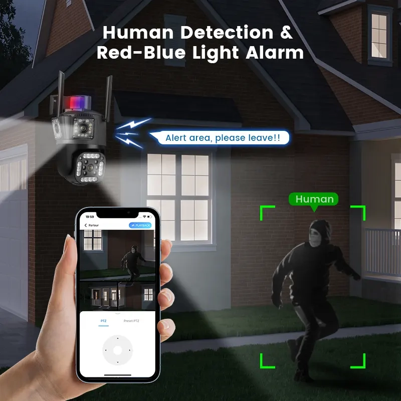 Технічні характеристики: - три об'єктиви, три сенсори та дизайн із трьома екранами, що дозволяє бачити більше деталей; - 6K-камера має надширокий кут огляду + 4-кратний цифровий зум, що забезпечує чіткий моніторинг далеких та близьких відстаней; - Оснащена антеною з високим коефіцієнтом посилення 3dBi, ваша камера може приймати ширший діапазон сигналів; - Вбудований інфрачервоний світлодіод та білий світлодіод, що забезпечують чітке та барвисте денне/нічне зображення; - 3 режими зображення: розумний режим/інфрачервоний режим/кольоровий режим; Інфрачервоний режим - це режим увімкнення інфрачервоного випромінювання. Зображення чорно-біле, білий світлодіод вимкнено; Кольоровий режим: білий світлодіод світиться, день та ніч - кольорове бачення; - Виявлення руху 24/7; сигнал у режимі реального часу для захисту безпеки вашої родини; - Вбудовані високоякісні динаміки та мікрофони для безперешкодного двостороннього зв'язку; - Технологія придушення луни та шуму, ідеальний повнодуплексний голосовий ефект; - Підтримка Wi-Fi-з'єднання 2,4 ГГц (не підтримує Wi-Fi 5G); - Передача зображення в режимі реального часу, адаптивна мережа; - Підтримка RJ45 Комплектація: 1x PTZ-камера 1x Посібник користувача 1x Блок живлення 1x Сумка для гвинтів