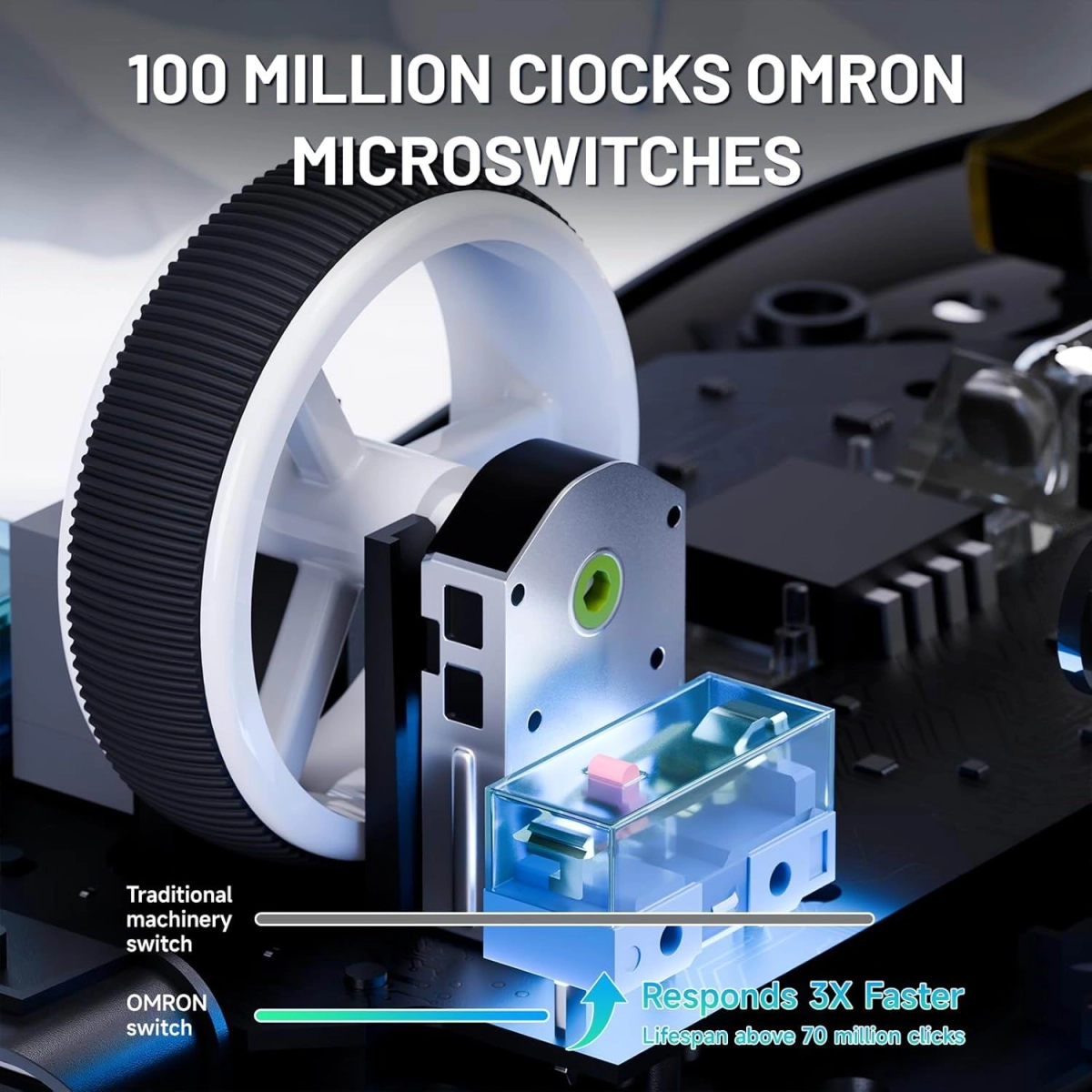 Використовує оптичні перемикачі, розраховані на 100 мільйонів кліків, що забезпечують надшвидкий тактильний зворотний зв'язок з нульовою затримкою відскоку. Вбудований інтелектуальний драйвер зі штучним інтелектом автоматично розпізнає вашу систему та завантажує оптимізовані налаштування, або ви можете вручну встановити драйвер, щоб розблокувати розширені функції, включаючи налаштування макросів, керування RGB, регулювання частоти опитування та точне налаштування DPI.