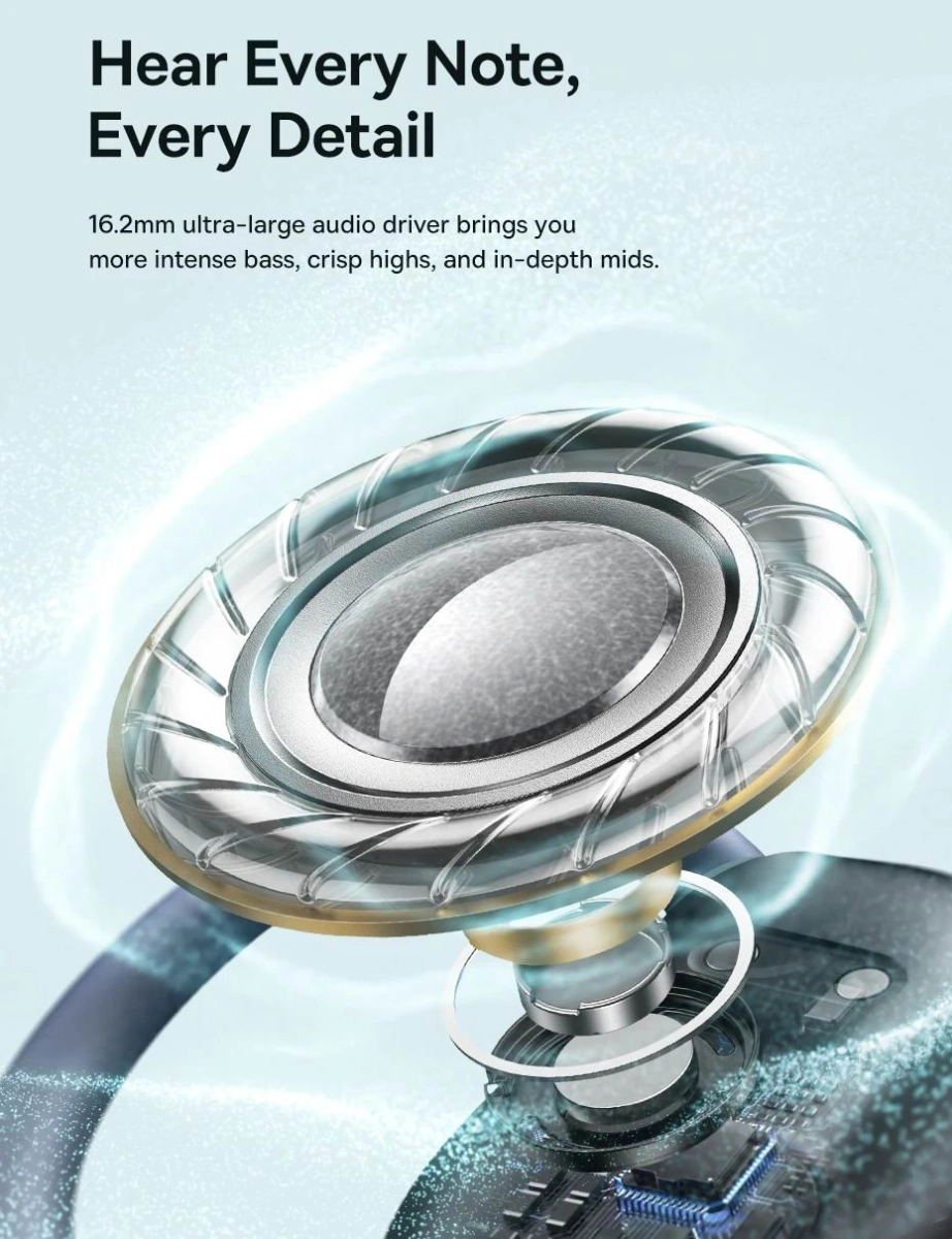 Попри відкриту конструкцію, навушники оснащені динамічними драйверами розміром 16,2 мм, які забезпечують чистий, об'ємний звук з підсиленими басами. Завдяки цьому музика звучить природно, а голос у подкастах передається чітко.