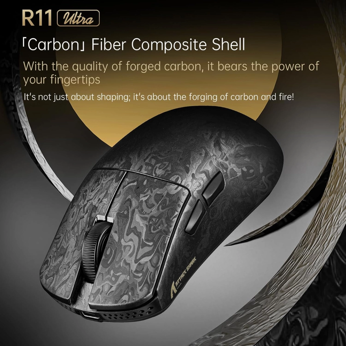 Відчуйте R11 ULTRA – бездротову мишу, виготовлену з вуглецевого композиту для неперевершеної міцності та надзвичайно легкої спритності. Вага всього 49 грамів – на 22% легша за G Pro X та на 14% легша за V4 Pro – вона легко ковзає для точного керування в RPG, MMO, FPS, MOBA, Battle Royale та будь-якій швидкій битві.