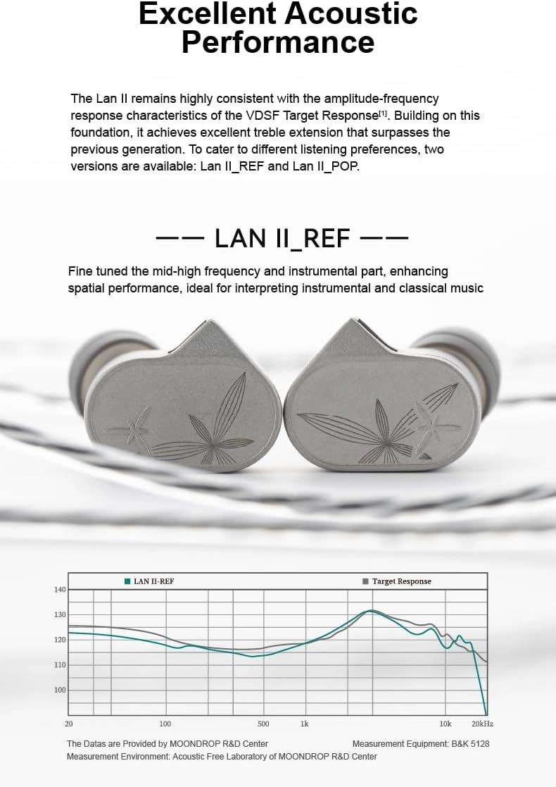 Moondrop LAN II 2 - це преміальні внутрішньоканальні навушники з суцільнометалевим корпусом з нержавіючої сталі, виготовленим за технологією MIM, який поєднує видатну міцність та вишуканий дизайн із лазерним гравіюванням. Вони оснащені новітньою композитною діафрагмою з ультратонким скляним куполом завтовшки всього 0,05 мм і високоефективною магнітною системою внутрішньо-зовнішнього типу на подвійних магнітах N52, що забезпечує щільність магнітного потоку більше 1 Тл, наднизькі спотворення та відмінну динаміку. Навушники випускаються у двох варіантах налаштування: LAN II REF - з акцентом на середньо-високі частоти, просторовість та інструментальну музику (ідеально для класики та оркестру), і LAN II POP - з підкресленим мід-басом та вокалом, що створює емоційну та атмосферну подачу для поп-, сучасної та поп-, сучасної музики. Звук налаштований за цільовою кривою VDSF Moondrop, що гарантує збалансовану тональність, розширені ВЧ та референсну якість навіть на високій гучності.