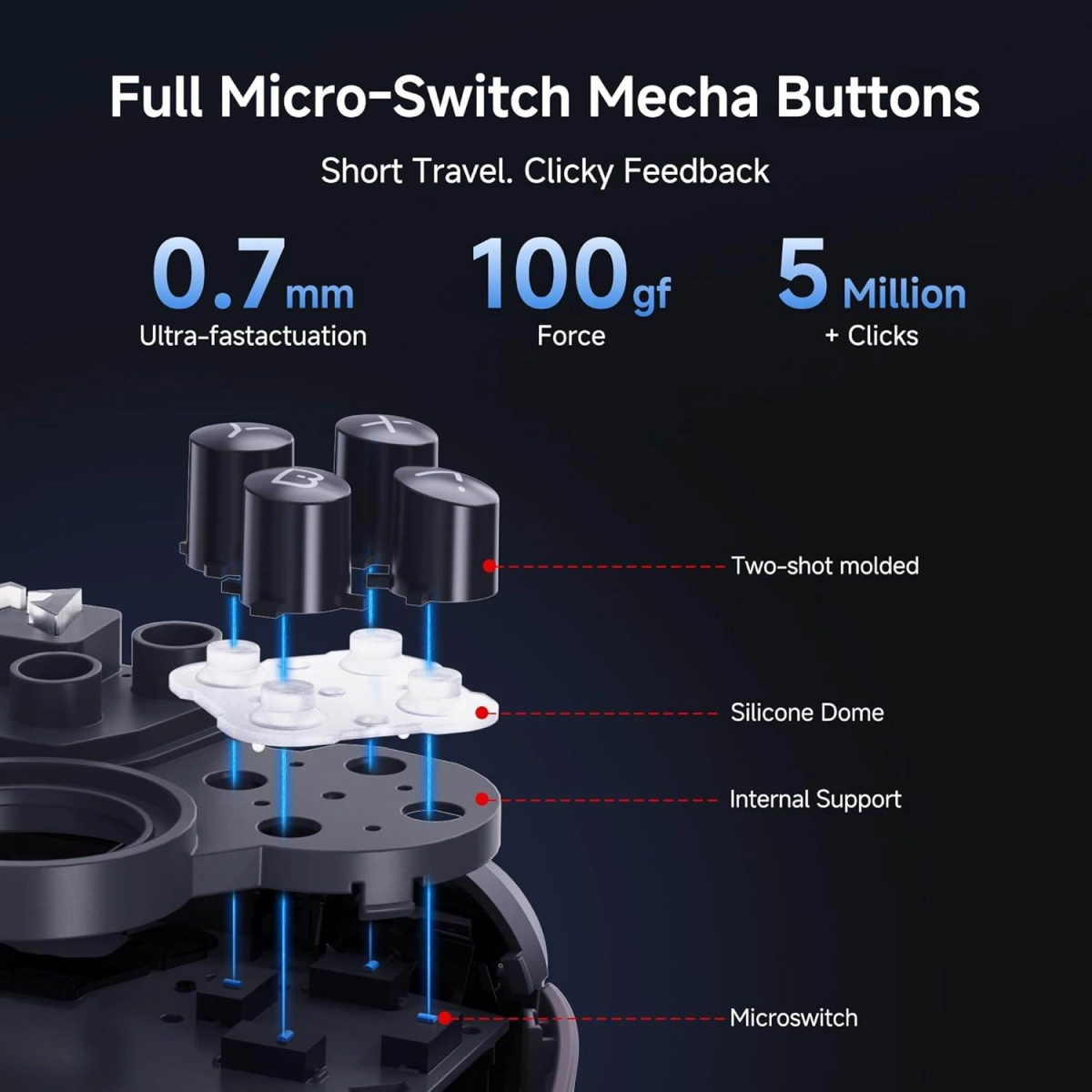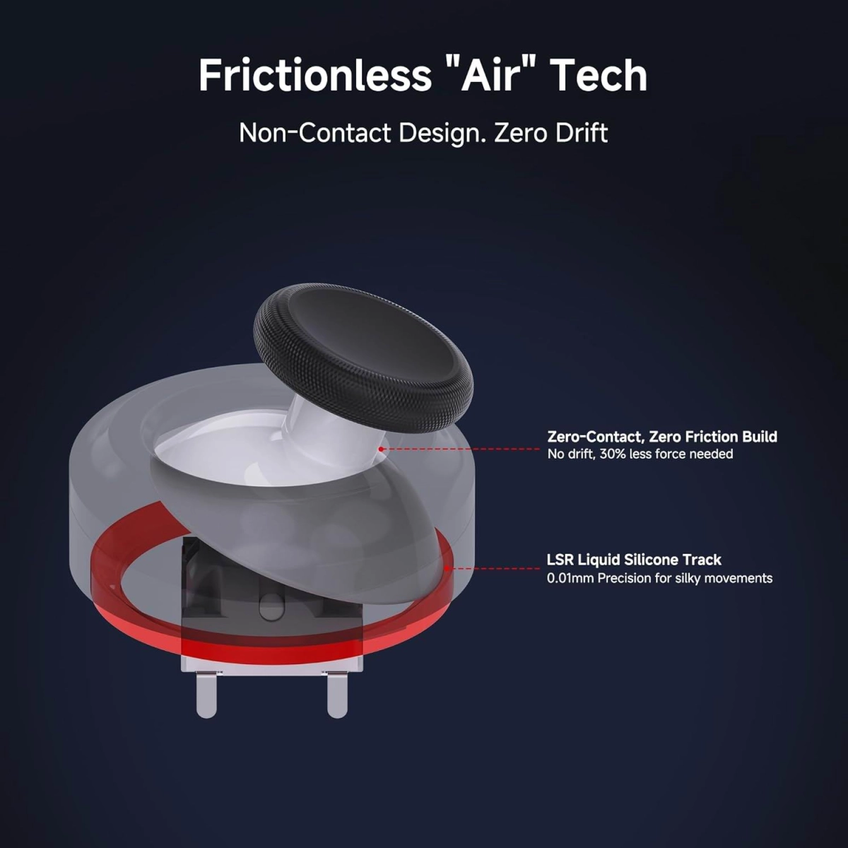 Використовують найновішу технологію TMR у поєднанні з рідким силіконовим кільцем LSR та перевернутою структурою ковпачка джойстика. Завдяки безконтактним магнітним датчикам забезпечується плавніше керування, ніж джойстики з ефектом Холла, а також плавне відчуття та нульовий дрейф. Забезпечує плавну роботу без дрейфу та високу точність для змагальних ігор.